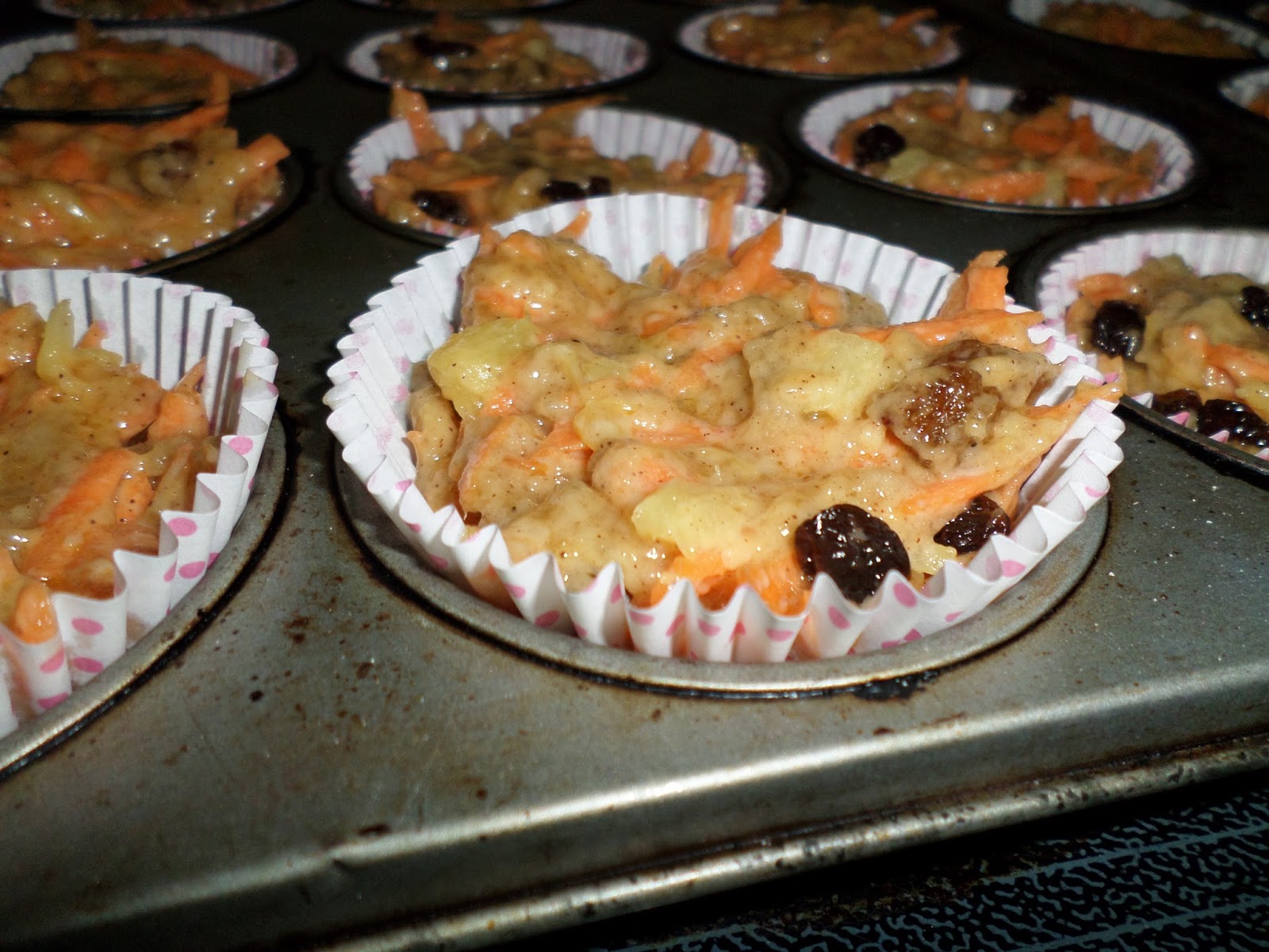 In a large bowl mix flour, brown sugar, baking powder, baking soda, salt, cinnamon and cloves. In a separate bowl mix pineapple, oil, egg and vanilla essence until blended. Make a well in the centre of the dry ingredients; add the pineapple mixture and stir to just combine. Stir in the carrots and raisins. Spoon the batter into the prepared muffin pans and bake 200C for 15 – 20 minutes.